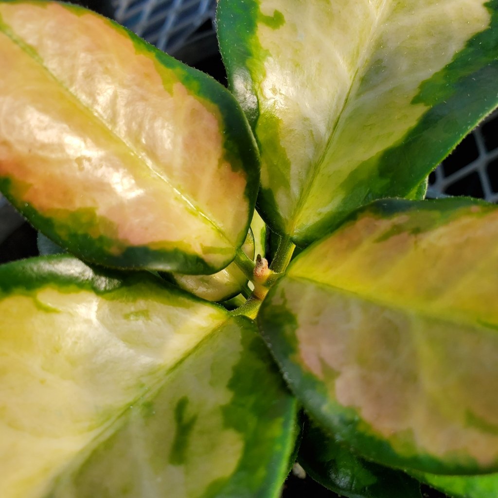 Hoya australis ‘Lisa’ has thick, shiny, ovate leaves with various vibrant light and dark green shades of variegation. When in bloom Lisa’s white flowers are marked with a red center and are quite fragrant. Best in bright indirect sunlight. Water freely while it is flowering, but allow the soil to become almost dry between waterings when the plants are not rapidly growing. Sold in a 4″ pot 14 fl. Oz. (414 ml).