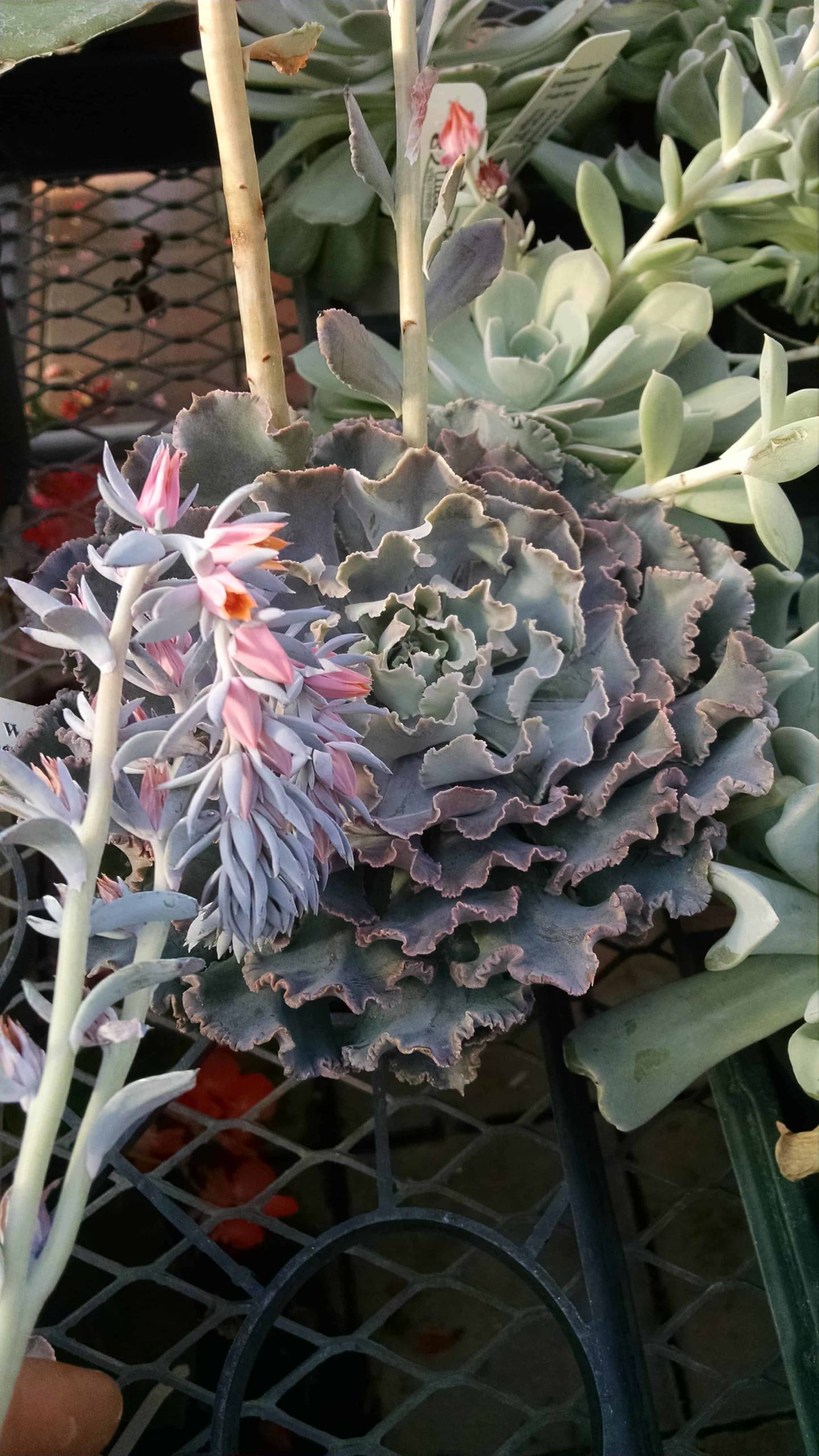 Shaviana Echeveria forms a rosette of gray-blue wavy foliage with each leaf tip curling irregularly to form a striking kaleidoscope. Echeveria are easy care, compact plants for a sunny location. Allow the soil to dry between thorough waterings. Sold in a 4″ pot (14 fl oz. (414 ml)).