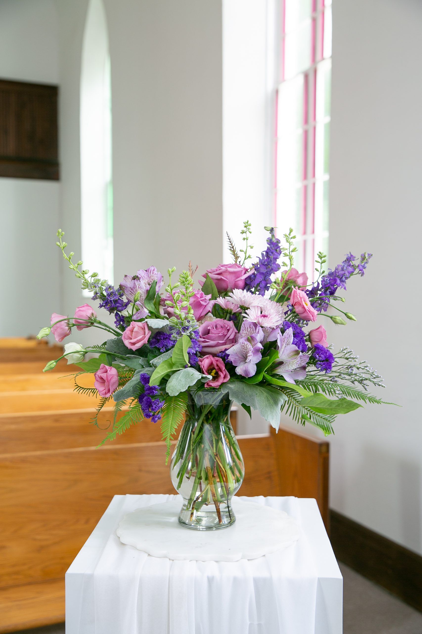 The Amethyst Tribute Bouquet by Studley’s sends your thoughtful remembrance. Our designers select shades of lavender and purple blooms. Next, we add roses, larkspur and chrysanthemums. We create this lush bouquet in a clear glass vase. A floral delivery of the Amethyst Tribute Bouquet by Studley’s delights every time. S40601209P125